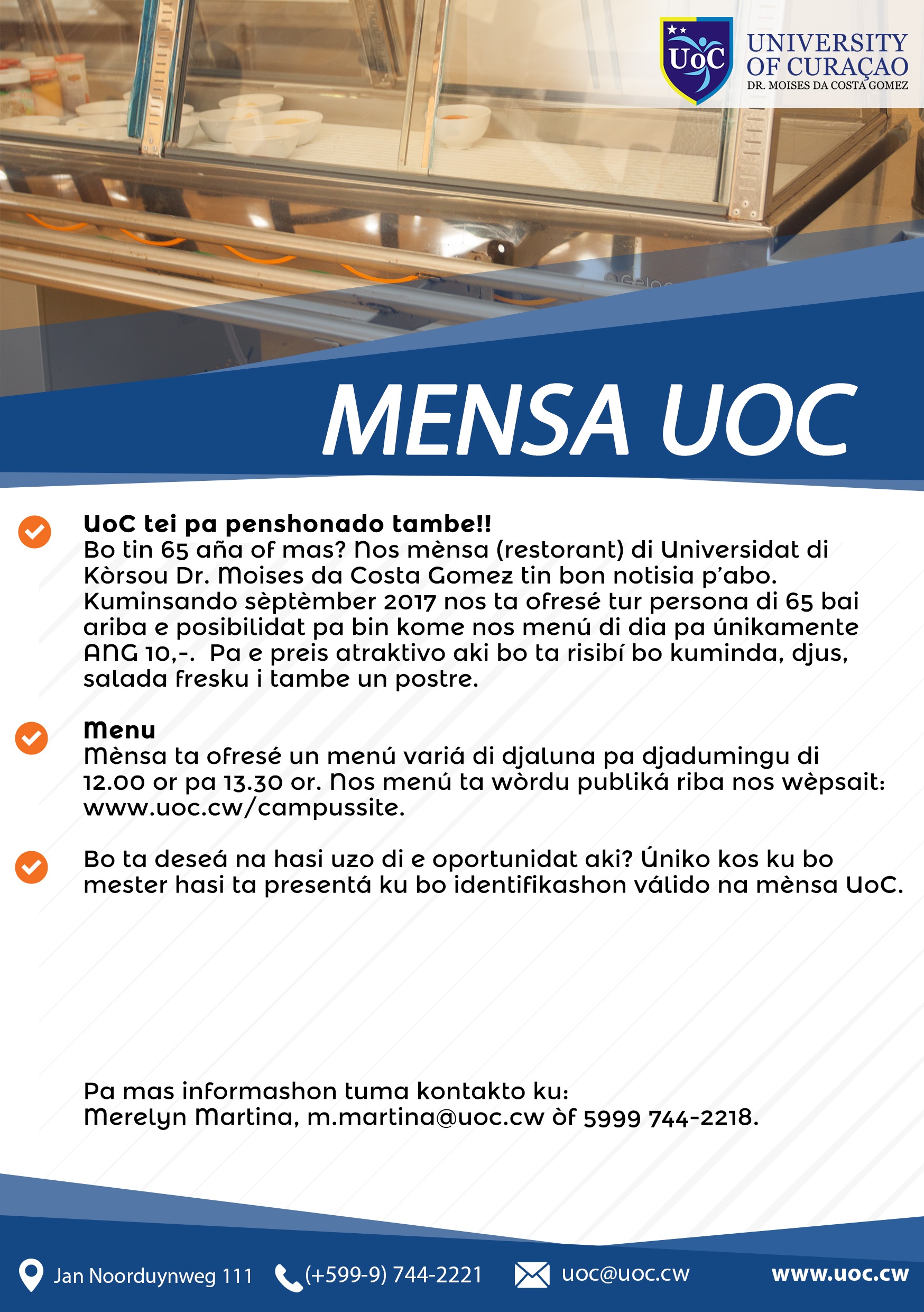Mensa Menu Hier vindt u het Weekmenu van de UoC Mensa. De Mensa heeft elke week een nieuw menu met gebalanceerde maaltijden en is open elke dag van 12:00 uur - 13:30 uur. Ochtend SNACKS: 08:00 - 10:00 uur Middag SNACKS: 15:00 - 17:30 uur 65+ KORTING Weekmenu: Jan 07-13 Jan 14-20 Mensa Food Feedback Form